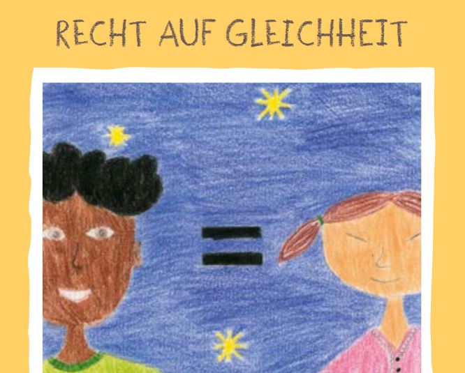 In einem weiteren Schritt wird ein Plakat aus 16 Einzelbildern in Partnerarbeit wie viel Arbeit je nach Gruppengröße und Lerngruppe zum Thema Kinderrechte gestaltet. Dazu wird eines der Kinderrechte ausgewählt und die Lernenden planen ein Bild, wie dieses Kinderrecht von ihnen zeichnerisch und mit Slogan umgesetzt werden kann. Ein Beispiel Plakat ist ebenfalls auf Seite 24 im Material enthalten. Die Auflösung ist hoch genug, um es per Beamer zu projizieren. Es dient zur Inspiration bei der eigenen Umsetzung der Thematik, aber auch als Diskussionsgrundlage.