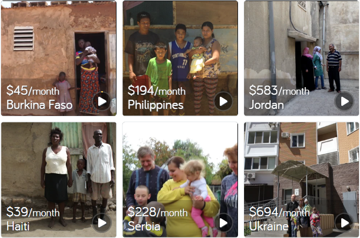 Diese Webseite zeigt mehr als 400 Familien aus 65 Ländern mit ihren Lebensbedingungen und Einkommen. In Gruppen werden Familien ausgewählt die nach eigener Vorstellung ein glückliches Leben führen. Die Familien können nach Betten, Haustieren, Sanitär, Essen, Kühlschränken (falls vorhanden) und dutzenden anderen Haushaltsartikeln recherchierte werden. Auch eine Option der Auswahl von Ländern ist möglich.
