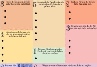 Diese Anregung mit drei Seiten ermöglicht das Entwickeln eigener Vorsätze für das neue Jahr. Dabei werden Vorschläge gemacht. Orte die man besuchen will, sachen die man tun möchte, Personen die großen Eindruck hinterlassen haben, Wege anderen Menschen zu helfen und viele und viele Punkte mehr können dabei ausgefüllt werden. Über ein ähnliches Muster wird die Reflexion des letzten Jahres ermöglicht. Die tiefe der Reflexion kann entsperchend dem Alter der Lerngruppe angepasst werden.