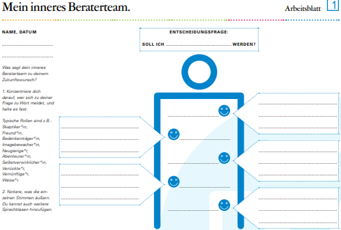 In einem ersten Schritt wird die eigene Bewertung des angestrebten Berufes über ein Material umgesetzt. Dazu werden denkbare Aussagen von Skeptikern, Abenteurern, Vernünftigen etc. zum eigenen Plan ausformuliert und eingetragen. Der nächste Schritt vertieft die Selbstanalyse, indem die Antworten der einzelnen inneren Stimmen gewichtet und bewertet werden. Dadurch soll der persönliche innere Entscheidungsprozess reflektiert und nach diesem differenzierten, sehr nützlichen Muster eingeübt werden. Erkenntnisse aus dem Vorgang werden notiert. In einem weiteren Schritt werden die Ergebnisse in Partnerarbeit vorgestellt und mit Feedback bedacht. Eine Anleitung für den Coach im Material übt hilfreiches Erteilen von Feedback. Nach dem detailliert erklärten Vorgang werden die Rollen getaucht.