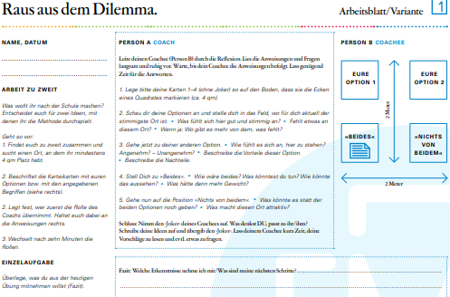 Eines der Gruppenmitglieder liest als Coach fünf Fragestellungen vor und die momentan entscheidende Person stellt sich an den Platz, der ihre Entscheidung widerspiegelt. Option 1, Option 2, beides oder nichts von beidem. Während die Person auf dem Feld steht, soll sie das Ergebnis Vorentscheidung visualisieren. Impulsfragen zu jeder Option und Position helfen dabei und werden vom Coach der Gruppe vorgelesen. Die persönlichen Ergebnisse dieses Vorgangs werden erneut festgehalten. Danach wechseln die Rollen, bis jeder einmal seine Entscheidung reflektiert hat. Anschließend können im Plenum das Gefühl während der Übung oder auch die Entscheidungen besprochen werden. Wurde ein Logbuch der vorhergehenden Stunden angefertigt, so kann dieses erneut durchgesehen und in seiner Gänze reflektiert werden. Haben sich während des Vorgangs der Berufs oder Lebenswegentscheidung Veränderungen ergeben? Ist eine Entscheidung erfolgt, oder wird noch gesucht?