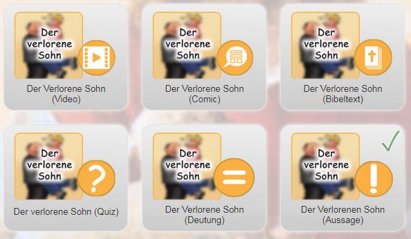 Am unteren Ende der Webseite befinden sich eine Reihe von 15 Quiz Anwendungen und Möglichkeiten der Lernüberprüfung. Dazu gehört das Erraten von Zitaten, die Zuordnung von Textausschnitten, das Einsortieren von Bildern zu den Gleichnissen und das Ordnen von Szenen.