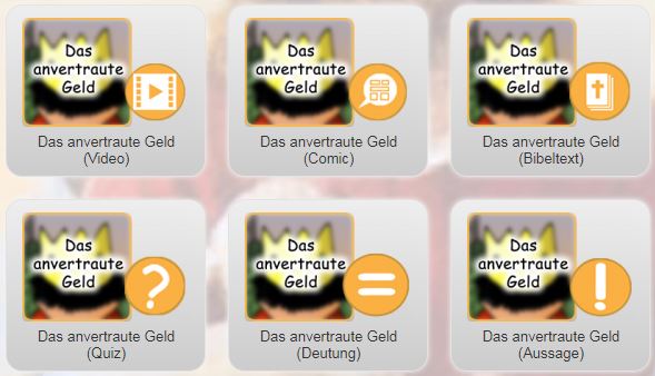 Am unteren Ende der Webseite befinden sich eine Reihe von 15 Quizanwendungen und Möglichkeiten der Lernüberprüfung. Dazu gehört das Erraten von Zitaten, die Zuordnung von Textausschnitten, das Einsortieren von Bildern zu den Gleichnissen und das Ordnen von Szenen.