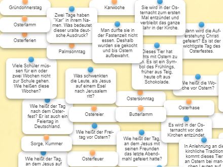 Die Anregung "Osterbegriffe" bietet eine interaktive Übung zum Verbinden von Festtagen und Bräuchen zu Ostern mit entsprechenden Beschreibungen. Werden die beiden Felder zusammengezogen, verbinden sie sich. Die Verbindung kann durch erneutes Klicken auf sie wieder gelöst werden. Das blaue Icon unten links ermöglicht die Überprüfung der Auswahl. Das blaue Icon unten links ermöglicht die Überprüfung der Auswahl. Durch übereinanderziehen der Text und Bildfelder werden diese verbunden. Durch klicken kann die Verbindung gelöst werden. Durch das Pfeilicon oben rechts kann das Bild auf den ganzen Bildschirm vergrößert werden.