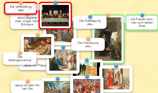 Die Anregung "Kreuzigung und Auferstehung Jesu in den Evangelien" bietet eine interaktive Übung zum Verbinden von Bildern mit entsprechenden Beschreibungen der Ostergeschichte. Werden die beiden Felder zusammengezogen, verbinden sie sich. Die Verbindung kann durch erneutes Klicken auf sie wieder gelöst werden. Das blaue Icon unten links ermöglicht die Überprüfung der Auswahl.