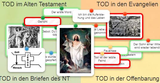 Die Anregung "TOD: Tod in der Bibel" bietet eine interaktive Möglichkeit zum Zuordnen von Inhalten zu Tod im Alten Testament, Tod in den Evangelien, Tod in den Briefen des NT, Tod in der Offenbarung. Das blaue Icon unten links ermöglicht die Überprüfung der Auswahl. Die enthaltenen Punkte sind nur mit detaillierter Bibelkenntnis zuzuordnen. Die Darstellung der Offenbarung mit dem Feuersee und dem neuen Jerusalem stehen der Theologie des Neuen Testament mit dem Sieg Jesu über dem Tod und den Perspektiven der Evangelien zum Tod aus Liebe und dem Tötungsverbot im AT gegenüber. Alle vier zeigen einen anderen Fokus auf das Thema Tod.