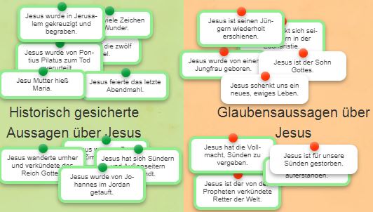 Die Anregung "Jesus - geschichtliche Fakten und Glaubensaussagen" bietet eine interaktive Möglichkeit 19 zentrale Begriffe zum historischen und biblischen Jesus zuzuordnen. Das Jesusbild enthält historisch über z.B. Flavius Josephus belegbare Teile und Glaubensinhalte. Das blaue Icon unten links ermöglicht die Überprüfung der Auswahl.