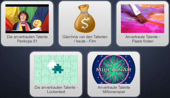 Die Anregung "Gleichnis-anvertraute Talente Sammlung 81" enthält fünf interaktive Webrätsel und Videoanalysen. Fragen werden beantwortet und Texte werden Bildern zugeordnet. Eine Videoanalyse der Perikope mit anschließendem Rätsel ist der erste Schritt. Ein weiterer Schritt besteht in der zuordnung eigener Fähigkeiten und Talenten zu entsprechenden Bildern. Der nächste Schritt enthält ein Lückentext. Das fünfte Material ist ein "Wer wird Millionärquiz". Das blaue Pfeil Icon oben links lässt den Nutzer zur vorherigen Seite zurückkehren. So kann auch die Übung neu gestartet werden.
