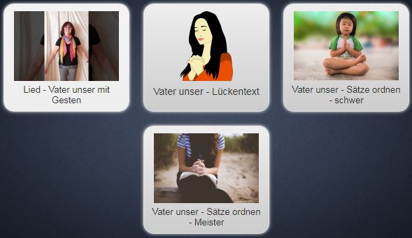 Die Anregung "Vater unser - Gebet Jesu" enthält vier interaktive Webrätsel. Ein Lückentext und das ordnen der Sätze ermöglichen die detailiertere Auseinandersetzung mit dem Text des Gebetes.