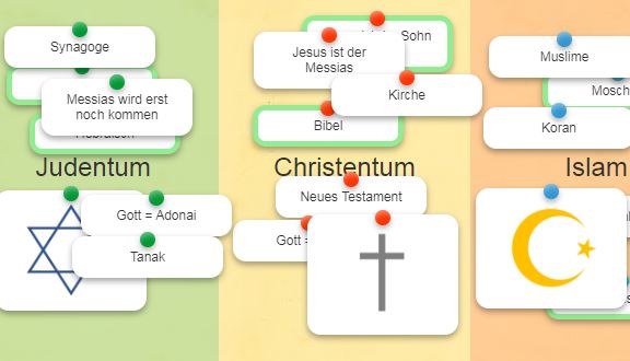 Die Anregung "Judentum Christentum Islam?" bietet eine interaktive Übung zur Einteilung von 20 Begriffen zu den drei Weltreligionen. Die Begriffe werden in die drei Felder der Religionen gezogen. Das Überprüfen der Korrektheit ist durch das blaue Feld in der rechten unteren Ecke möglich. Dabei werden die Begriffe grün oder rot umrandet.