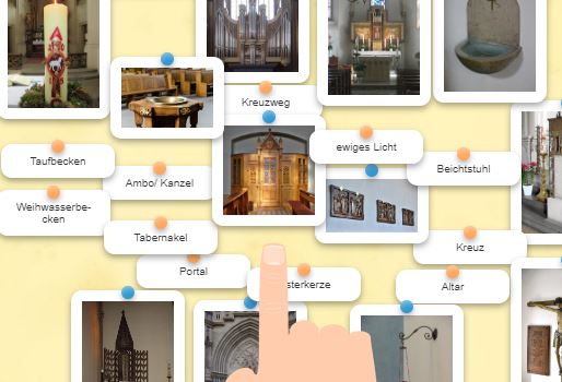 Die Anregung "Bestandteile der christlichen Kirche" bietet eine interaktive Möglichkeit 12 Bilder der Inhalte des Kirchenraumes Namen zuzuordnen.