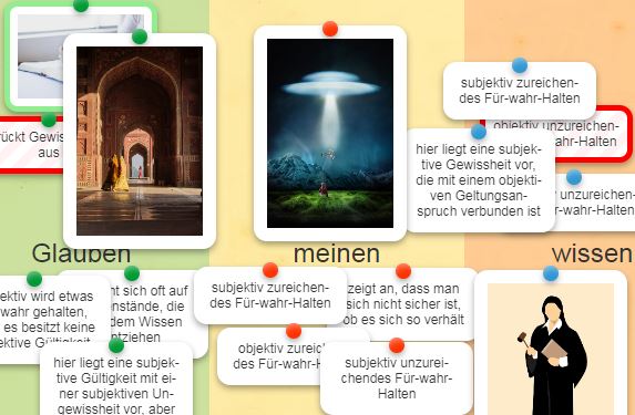 Die Anregung "Meinen, glauben oder wissen?" ermöglicht über eine interaktive Übung das Zuordnen von Bildern und Sätzen zu Meinung, Glauben und Wissen. Dabei werden diese in ein Feld hinein geschoben. Das blaue Icon unten rechts ermöglicht die Prüfung der Auswahl. Ein Fehler wird rot unterlegt. Ein Erfolg erscheint grün unterlegt. Durch das Pfeilicon oben rechts kann das Bild auf den ganzen Bildschirm vergrößert werden.