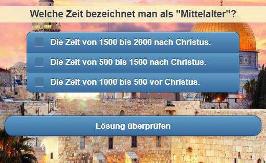 Die Anregung "Glauben und Wissen im Mittealter Quiz" enthält ein Webquiz mit 15 multiple Choice Fragen zum Mittelalter. Durch das Pfeilicon oben rechts kann das Bild auf den ganzen Bildschirm vergrößert werden.