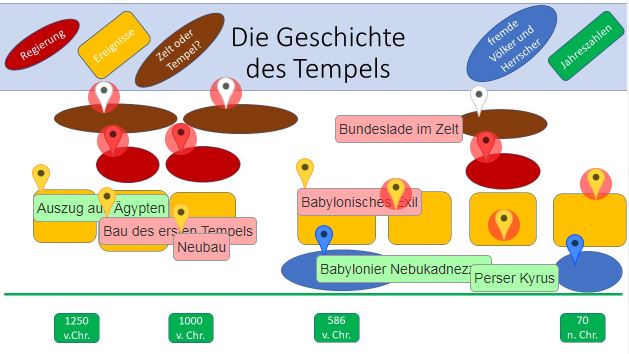 Die Anregung "Die Geschichte des Tempels in Jerusalem" bietet eine interaktive Webübung zur Erstellung einer Zeitleiste der Vorgänger in Jerusalem vom Auszug aus Ägypten bis zum Erscheinen der Perser. Das Anklicken der tropfenförmigen Icons ermöglicht eine Zuordnung einer Beschreibung zu Teilen der Zeitleiste. Das blaue Icon unten rechts ermöglicht die Prüfung der Auswahl. Ein Fehler wird rot unterlegt. Ein Erfolg erscheint grün unterlegt. Durch das Pfeilicon oben rechts kann das Bild auf den ganzen Bildschirmm vergrößert werden.