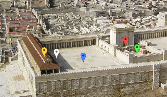 Die Anregung "Tempel in Jerusalem (Herodes)" bietet eine interaktive Methode, die Lebenswelt zur Zeit Jesu zu untersuchen. Das Anklicken der tropfenförmigen Icons ermöglicht zudem eine Zuordnung einer Beschreibung zu dem jeweiligen Bild. Das blaue Icon unten rechts ermöglicht die Prüfung der Auswahl. Ein Fehler wird rot unterlegt. Ein Erfolg erscheint grün unterlegt. Durch das Pfeilicon oben rechts kann das Bild auf den ganzen Bildschirm vergrößert werden.