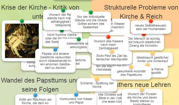 Die Anregung "Die Reformation und ihre Ursachen" ermöglicht über eine interaktive Übung das Zuordnen von Bildern und Sätzen zum Thema. Dabei werden diese in ein Material mit vier Feldern hinein geschoben. Die Unterteilungen sind Krise der Kirche, strukturelle Probleme von Kirche und Reich, Wandel des Papstums und seine Folgen sowie Luthers neue Lehren. Das blaue Icon unten rechts ermöglicht die Prüfung der Auswahl. Ein Fehler wird rot unterlegt. Ein Erfolg erscheint grün unterlegt. Durch das Pfeilicon oben rechts kann das Bild auf den ganzen Bildschirm vergrößert werden.