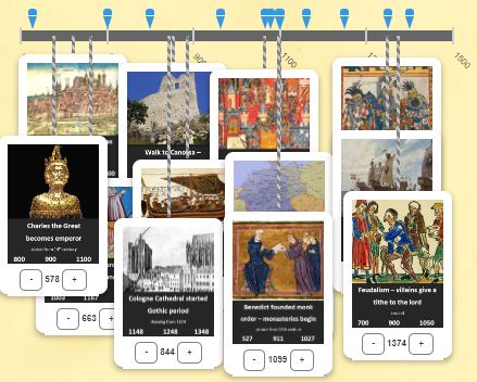 Die Anregung "timeline Middle Ages" enthält eine interaktive Zeitleiste mit zwölf Zeitpunkten biette eine Möglichkeit der Ordnung bedeutender Momente des Mittelalters. Die Zeitpunkte werden in die oben enthaltene Zeitleiste eingesetzt. Dies geschieht durch Drag and Drop. Dann kann der genaue Zeit. mit dem Plus oder Minuszeichen eingestellt werden. Das blaue Icon unten rechts ermöglicht die Prüfung der Auswahl. Ein Fehler wird rot unterlegt. Ein Erfolg erscheint grün unterlegt. Durch das Pfeilicon oben rechts kann das Bild auf den ganzen Bildschirm vergrößert werden.