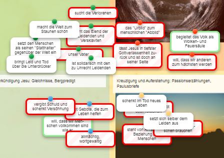 Die Anregung "Biblische Gottesbilder" bietet eine interaktive Möglichkeit zentrale Charakteristika des Gottesbildes in der Genesis, Exodus, Bergpredigt und Gleichnissen, Kreuzigung und Auferstehung. 20 Begriffe werden in vier Felder der Bibelteile verschoben. Das blaue Icon unten links ermöglicht die Überprüfung der Auswahl. Durch das Pfeilicon oben rechts kann das Bild auf den ganzen Bildschirmm vergrößert werden.