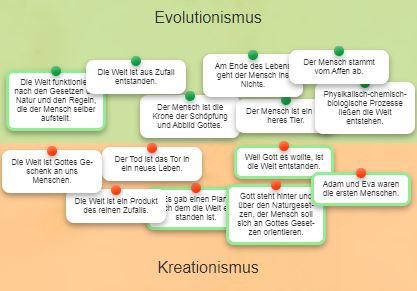Die Anregung "Evolutionismus oder Kreationismus?" bietet eine interaktive Möglichkeit zentrale Konzepte der beiden Theorien zuzuordnen. 14 Begriffe werden in zwei Felder der Theorien verschoben. Das blaue Icon unten links ermöglicht die Überprüfung der Auswahl. Durch das Pfeilicon oben rechts kann das Bild auf den ganzen Bildschirm vergrößert werden.