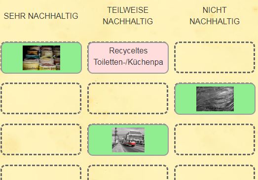 Die Anregung "Zuordnungsspiel Nachhaltigkeit" bietet eine interaktive Möglichkeit 23 Begriffe und Bilder zu Konsumgegenständen und Nahrungsmitteln den Feldern sehr nachhaltig, teilweise nachhaltig und nicht nachhaltig zuzuordnen. Das blaue Icon unten links ermöglicht die Überprüfung der Auswahl. Durch das Pfeilicon oben rechts kann das Bild auf den ganzen Bildschirm vergrößert werden.