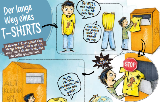 Die Anregung "Der lange Weg des T Shirts" beschriebt als Cartoon den Weg der Baumwolle bis zum fertigen T Shirt und die Schäden bei Personen und an der Umwelt, die dabei bestehen. Dabei werden acht Stationen passiert. Die Materialien werden durch ein halbes Dutzend Länder verschifft und verbrauen dabei Unmengen Energie. Der ganze Vorgang wird als unökonomisch dargestellt. Kleidung wird zum Wegwerfprodukt, das nicht mal mehr gewaschen wird. Das Plakat hinterfragt diese Entwicklung kritisch.