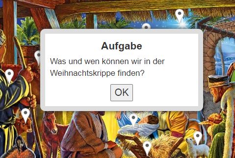 Dazu werden die grünen Symbole angeklickt und ein Gegenstand wird im sich öffnenden Menü ausgewählt. Das blaue Icon unten links ermöglicht die Überprüfung der Auswahl. Die Marker werden dann rot umrandet oder bei richtiger Auswahl erscheint ein grüner Schriftzug mit dem Namen den Gegenstandes.