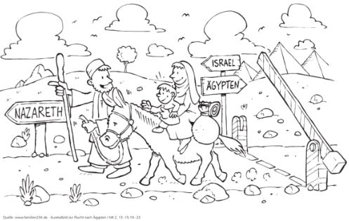 Dieses Ausmalbild behandelt die Flucht der heiligen Familie nach Ägypten.