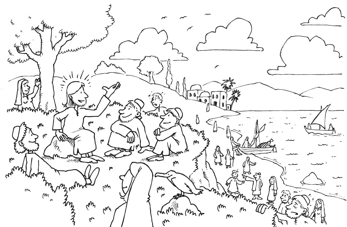 Dieses Ausmalbild behandelt die Seligpreisungen, in denen Jesus den Menschen Glück wünscht, wenn sie sich gut verhalten.