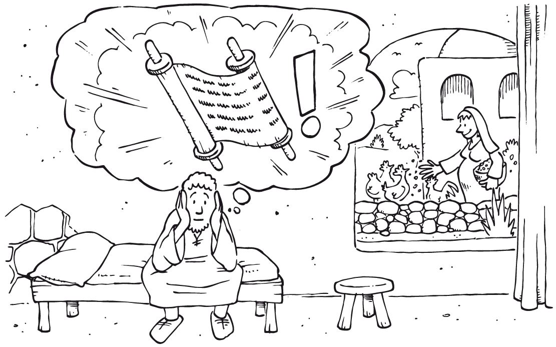 Dieses Ausmalbild behandelt Josefs Traum, wie er der Vater von Jesus dem Gottessohn werden wird. Josef bleibt treu und hält zu Maria, auch wenn er nicht der wirkliche Vater Jesu ist.