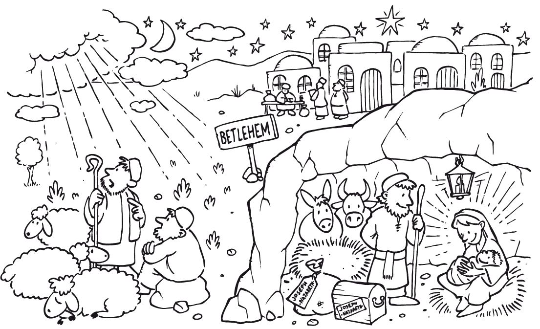 Dieses Ausmalbild behandelt die Weihnachtsgeschichte.