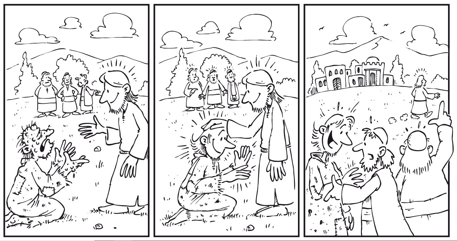 Dieses Ausmalbild behandelt die Freude über eine schöne gute Sachen und den Wunsch das Erlebte mit der ganzen Welt zu teilen. So teilt der Aussätzige seine Heilung mit der ganzen Stadt, obwohl Jesus es verboten hatte.
