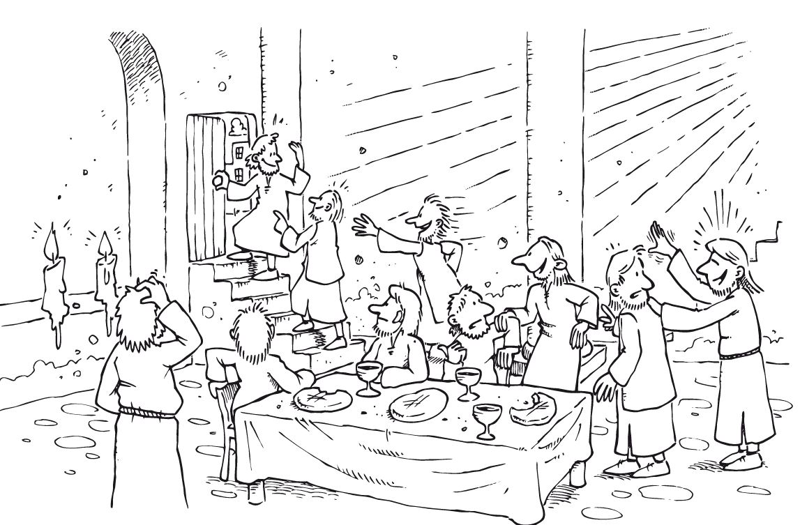 Dieses Ausmalbild behandelt den Heiligen Geit, der über die Jünger kommt. Probiert es selbst aus: Um jemanden anzuhauchen oder anzupusten muss man ganz nahe bei ihm stehen. So erzählt uns jeder Atemzug, dass Jesus uns ganz nahe ist. Er bläst seinen Atem in uns hinein. Wenn wir atmen, können wir seinen Heiligen Geist spüren.