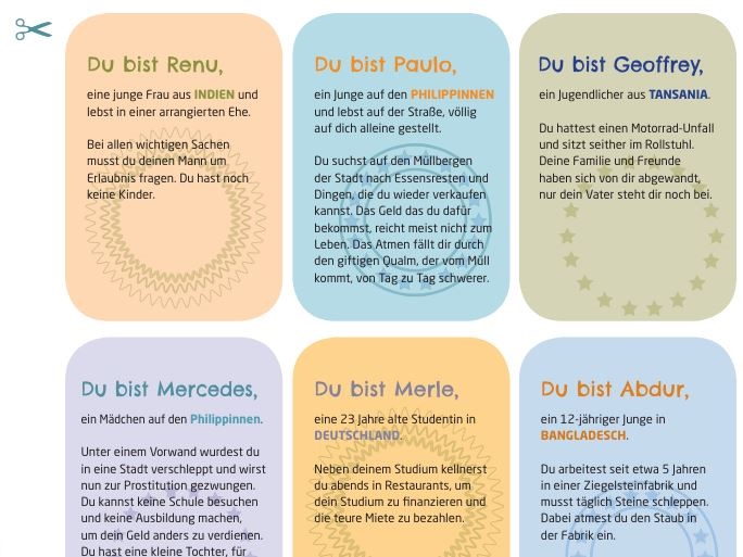Zum Einstieg kann ein Video zu unterschiedlichen Lebensbedingungen global gezeigt werden. Das Video ist im Dropdown-Menü eingebettete Medien sowie unter "Medium öffnen" auf dieser Seite zu finden. Dann erfolgt die Einführung in die Methode. Dann findet das Rollenspiel selbst statt. Die Auswertung erfolgt über ein weiters Material aus der PDF mit der Anleitung.