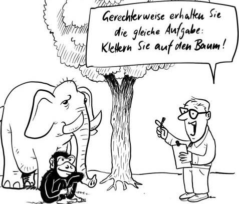 Der Einstieg gelingt durch eine bekannte Karikatur auf der ein Affe und ein Elefant die gleiche Aufgabe erhalten. Sie sollen auf einen Baum klettern. Die Lernenden thematisieren inwiefern es manchmal gerechter ist wenn zwei Personen nicht dieselbe Aufgabe bekommen.