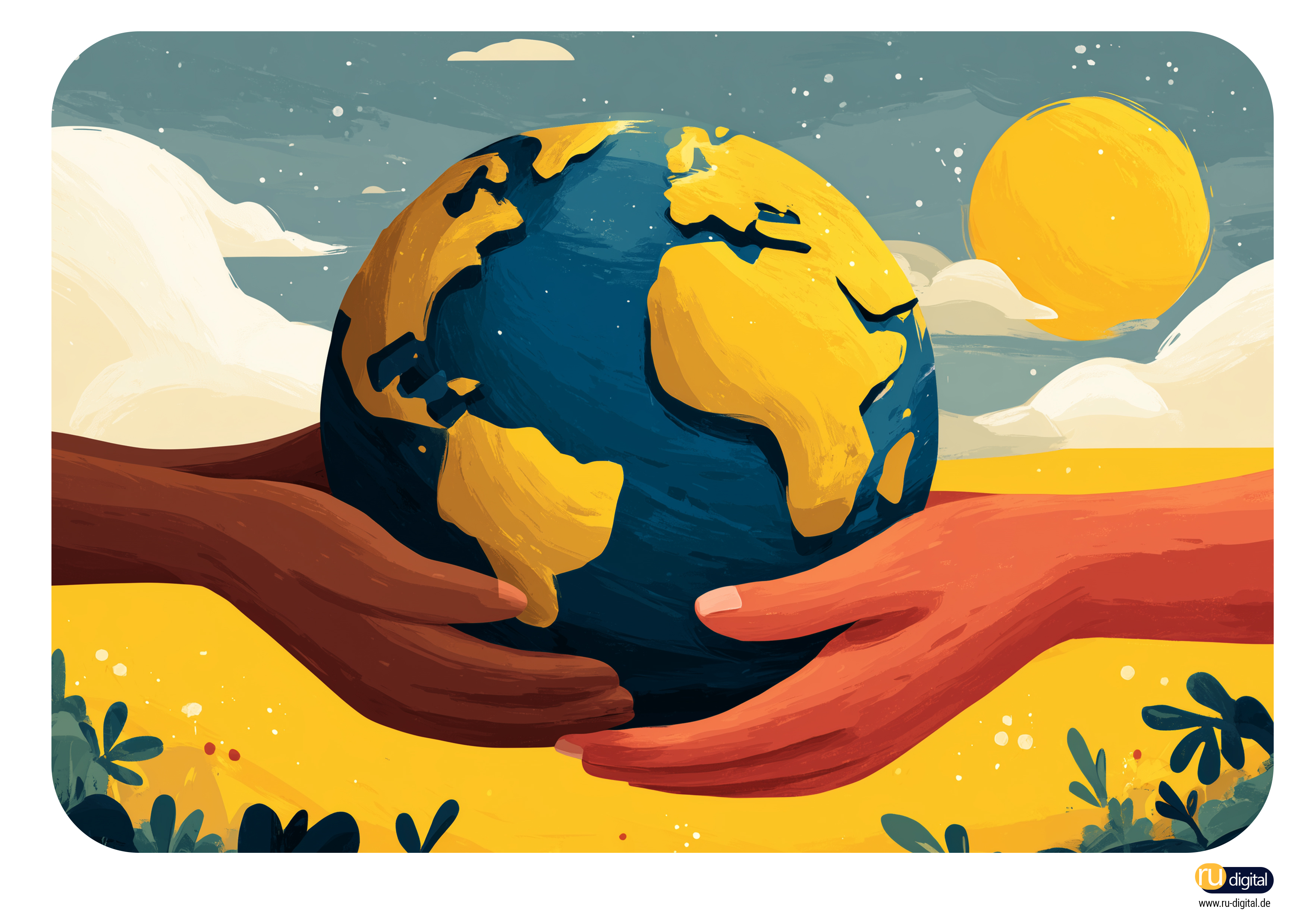 Diese Illustration zeigt zwei Hände, die eine Erdkugel behutsam halten. Sie steht als Symbol für Verantwortung, Bewahrung und Gemeinschaft auf unserem Planeten. In der religiösen Deutung erinnert sie an Gottes Schöpfung und Auftrag an den Menschen, die Erde zu hüten und zu pflegen: „Macht euch die Erde untertan“ (Gen 1,28) – verstanden nicht als Herrschaft, sondern als Auftrag zum sorgsamen Umgang mit allem Leben. Die Erde ist ein Geschenk, das allen Menschen gehört, und Ausdruck von Gottes Güte und Kreativität.