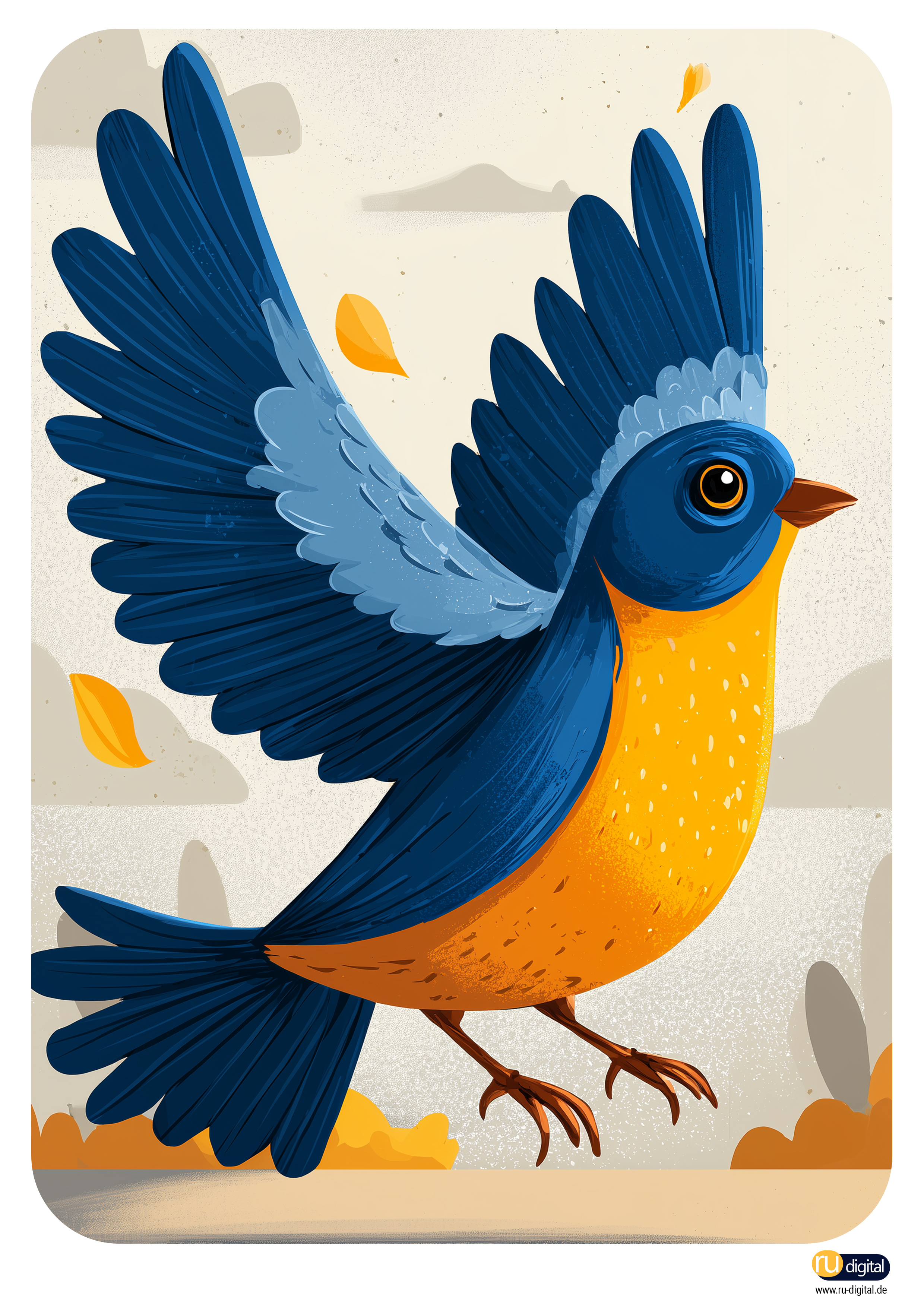 Diese Illustration zeigt einen leuchtend blauen und gelben Vogel im Flug. Mit weit ausgebreiteten Flügeln wirkt er lebendig, frei und voller Energie.