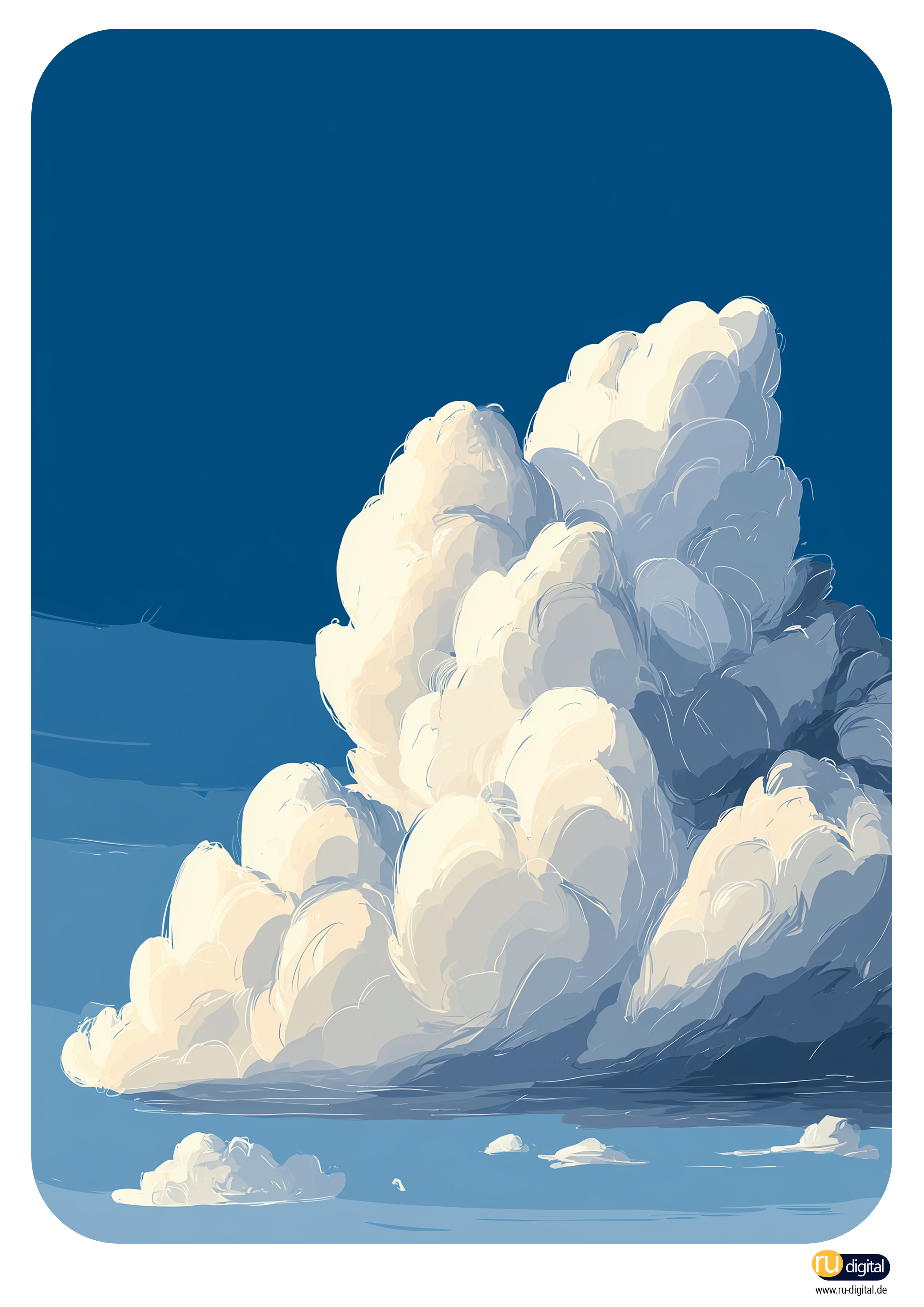 Diese Illustration zeigt eine große, helle Wolke vor tiefblauem Himmel. Die Wolke wirkt leicht und majestätisch zugleich – ein Sinnbild für Weite, Hoffnung und Gottes Gegenwart.