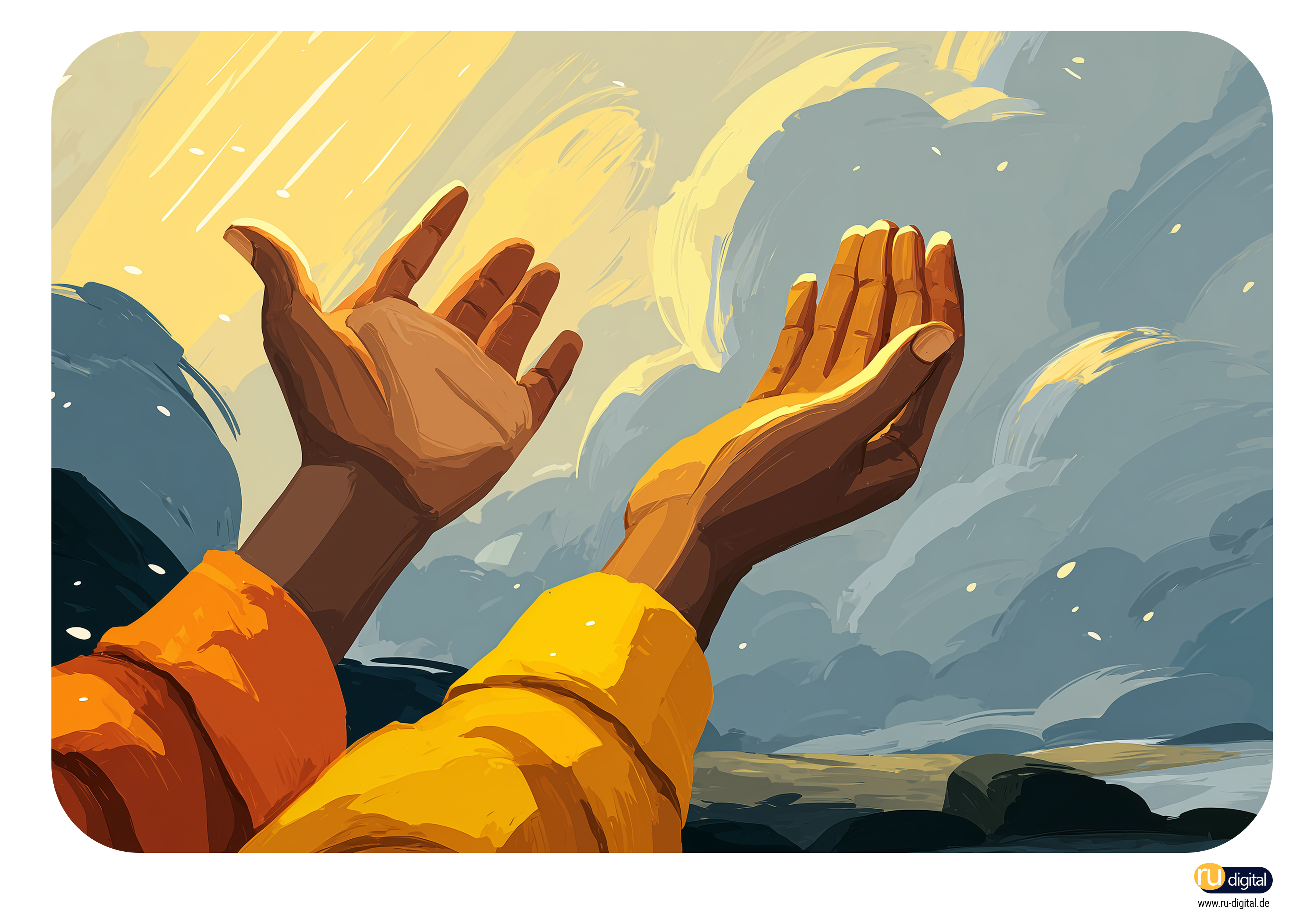 Diese Illustration zeigt zwei nach oben geöffnete Hände vor einem hellen, lichtdurchfluteten Himmel. Das Bild vermittelt Hoffnung, Vertrauen und Verbindung zu Gott.
