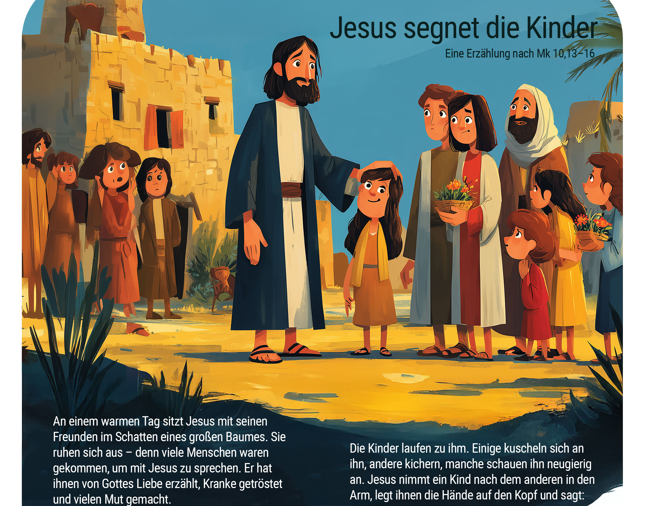Die Geschichte sollte zunächst ruhig und anschaulich erzählt werden, damit die Kinder in die Szene eintauchen können. Eine dialogische Erzählweise – mit kleinen Fragen, die die Kinder aktiv einbezieht („Wie fühlen sich die Kinder, wenn sie weggeschickt werden?“ oder „Was denkt ihr, wie Jesus schaut, als er sie ruft?“) – öffnet emotionale Zugänge und stärkt die Identifikation. Visualisierungen mit Legematerialien, Bodenbildern, Figuren oder Bildkarten unterstützen das Verstehen. Besonders wirksam ist die performative Dimension: Kinder können erleben, was es bedeutet, gesegnet zu werden, indem sie einander mit einfachen Gesten – etwa einer Hand auf der Schulter oder einem Kreuzzeichen auf der Stirn – ein Segenswort zusprechen.