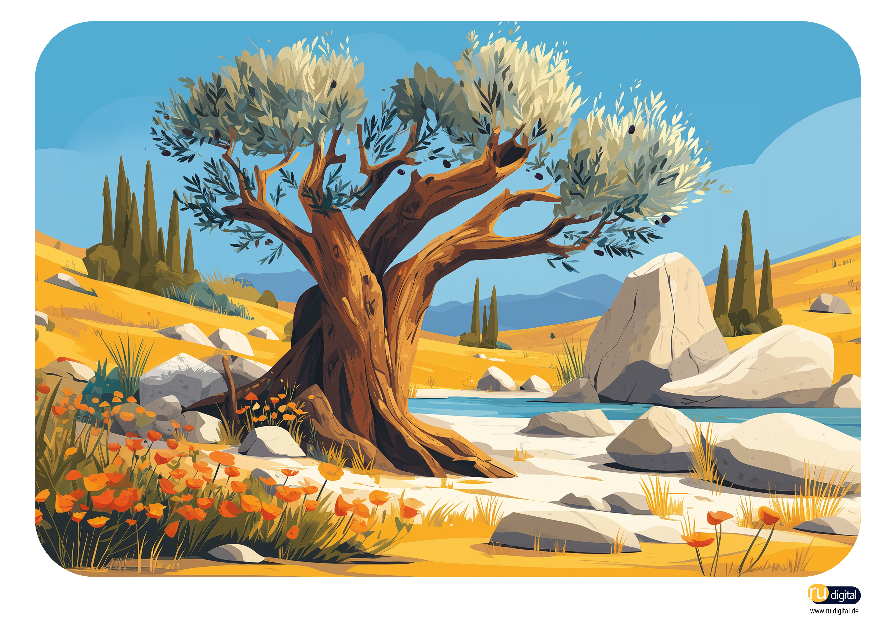 Diese Illustration zeigt einen alten Olivenbaum in weiter Landschaft – ein starkes Symbol für Frieden, Leben, Hoffnung und Verwurzelung.
