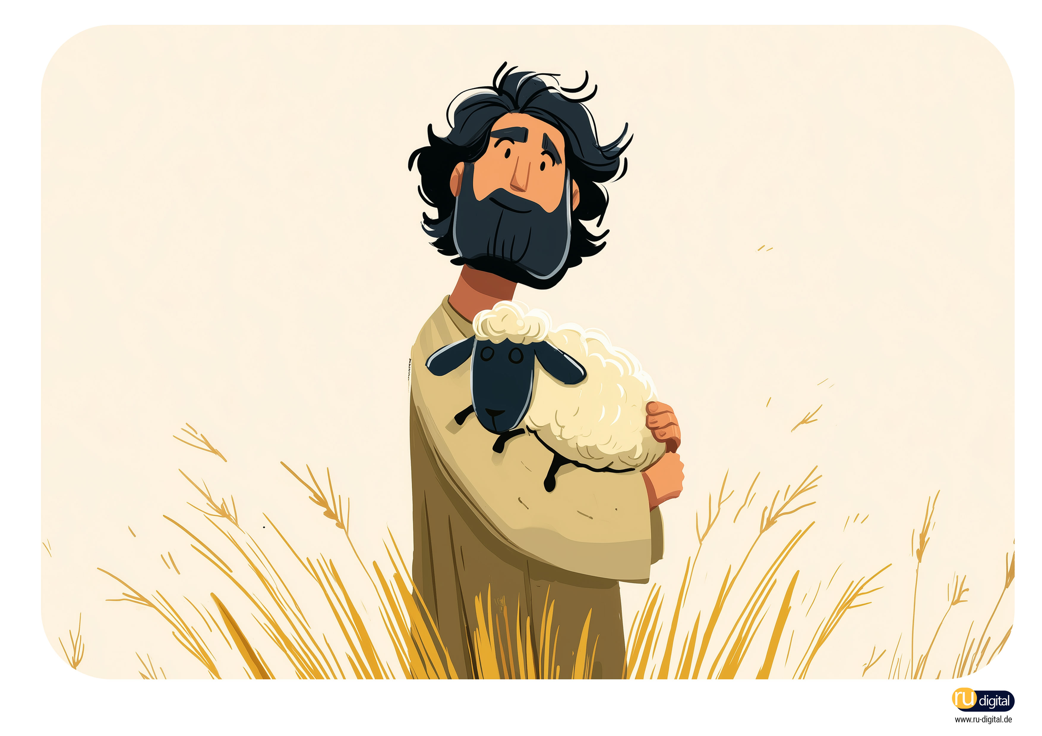 Das Motiv greift das Ende des Gleichnisses vom verlorenen Schaf (Lk 15,3–7) bildhaft auf: Das gefundene Schaf wird auf die Schultern genommen und mit Freude zurückgetragen. Die Darstellung betont weniger den Akt des Tragens als die innige Beziehung zwischen Hirte und Schaf. Auch Psalm 23 findet hier seine Erfüllung: „Du bist bei mir“ – die Zusage göttlicher Nähe wird sichtbar. Im Johannesevangelium (Joh 10,11–15) beschreibt Jesus sich als den guten Hirten, der seine Schafe kennt und dem sie vertrauen. Das Bild macht deutlich: Gottes Handeln zielt nicht nur auf Rettung, sondern auf Beziehung, Trost und bleibende Nähe.